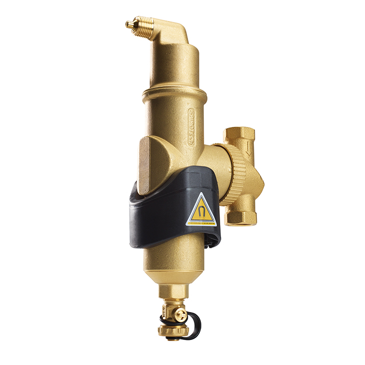 Kombinert mikroboble- og magnetittutskiller for montering på horisontale og vertikale rørstrekk. Fjerner effektivt mikrobobler og magnetiske og ikke-magnetiske partikler ned til 0,005mm i vannbårne varme- og kjøleanlegg. Enheten har en magnet som er montert på utsiden av enheten. Ved gjennomspyling trekkes magneten av enheten, slik at magnetiske partikler faller til bunn i enheten. Gjennomspyling utføres uten driftsstans.